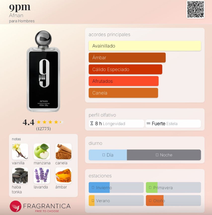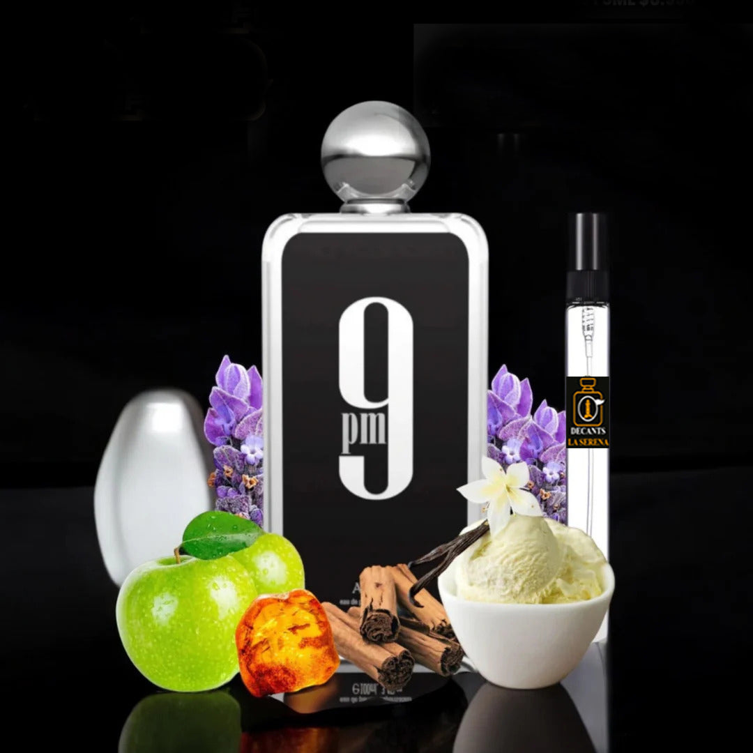 9pm de Afnan es una fragancia de la familia olfativa Oriental Vainilla para Hombres. 9pm se lanzó en 2020. Las Notas de Salida son manzana, canela, lavanda silvestre y bergamota; las Notas de Corazón son flor de azahar del naranjo y lirio de los valles (muguete); las Notas de Fondo son vainilla, haba tonka, ámbar y pachulí.