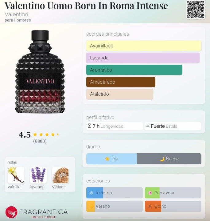 Valentino Uomo Born in Roma Intense Eau de Parfum es una fragancia masculina lanzada en 2023 que encapsula la esencia de la elegancia italiana con un toque moderno y audaz. Este perfume combina notas dulces y especiadas, creando un aroma sofisticado y envolvente, ideal para el hombre contemporáneo que busca destacar en cualquier ocasión.