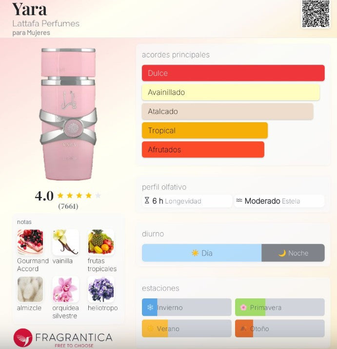 Yara de Lattafa Perfumes es una fragancia de la familia olfativa Oriental Vainilla para Mujeres. Yara se lanzó en 2020. Las Notas de Salida son orquídea, heliotropo y naranja tangerina; las Notas de Corazón son Acuerdo goloso y frutas tropicales; las Notas de Fondo son vainilla, almizcle y sándalo